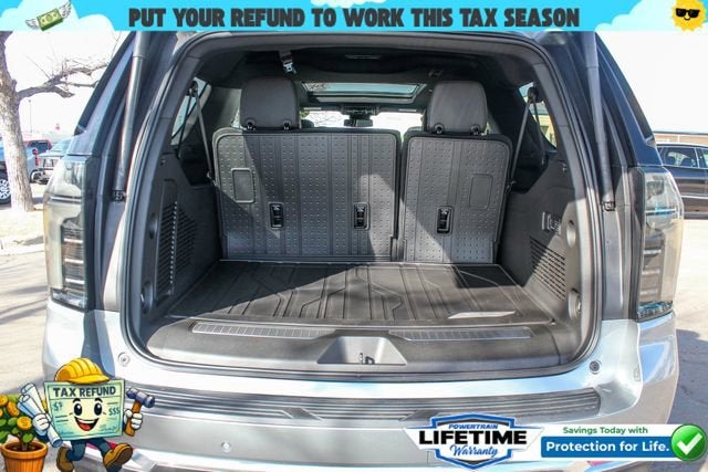 10 Speakers, 2-Speed Active Electronic AutoTrac Transfer Case, 20 x 9 Polished Aluminum Wheels, 3.23 Rear Axle Ratio, 3rd Row 60/40 Power-Folding Split-Bench, 3rd Row All-Weather Floor Liners, 3rd row seats: split-bench, 4-Way Power Driver Lumbar Seat Adjuster, 4-Way Power Front Passenger Lumbar Seat Adjuster, 4-Wheel Disc Brakes, 8-Way Power Driver Seat Adjuster, 8-Way Power Front Passenger Seat Adjuster, ABS brakes, Adaptive suspension, Advanced Trailering Package, Air Conditioning, All-Weather Cargo Mat, Alloy wheels, AM/FM radio: SiriusXM with 360L, Apple CarPlay/Android Auto, Auto High-beam Headlights, Auto-dimming door mirrors, Auto-Dimming Inside Rear-View Mirror, Auto-dimming Rear-View mirror, Auto-leveling suspension, Automatic temperature control, Blind Zone Steering Assist with Trailering, Bose 10-Speaker Surround with CenterPoint, Brake assist, Bright Front and Rear Door Sill Plates, Bumpers: body-color, Chrome Door Handles with Body-Color Strip, Chrome Mirror Caps, Compass, Delay-off headlights, Driver door bin, Driver vanity mirror, Dual Exhaust System, Dual front impact airbags, Dual front side impact airbags, Dual-Pane Power Panoramic Sunroof, Electronic Stability Control, Emergency communication system: OnStar Services capable, Engine Block Heater, Exterior Parking Camera Rear, Extra Capacity Cooling System, First and Second Rows Premium Floor Liners, Four wheel independent suspension, Front anti-roll bar, Front Bucket Seats, Front Center Armrest, Front dual zone A/C, Front fog lights, Front LED Fog Lamps, Front reading lights, Fully automatic headlights, Garage door transmitter, Heated 2nd Row Outboard Seats, Heated door mirrors, Heated Driver and Front Passenger Seats, Heated front seats, Heated Power-Adjustable Outside Mirrors, Heated rear seats, Heated Steering Wheel, Heated steering wheel, Hill Descent Control, Hitch View with Pan/Zoom Image Adjustment, Illuminated entry, Integrated Trailer Brake Controller, Interior Camera, LED Headlamps with LED Daytime Running Lamps, LED Tail Lamps, License Plate Front Mounting Package, Low tire pressure warning, Magnetic Ride Control Suspension, Max Trailering Package, Memory seat, Memory Settings, Molded Splash Guards, Navigation system: Google built-in compatibility (select service plan required, terms and limitations apply), Occupant sensing airbag, Outside temperature display, Overhead airbag, Overhead console, Panic alarm, Passenger door bin, Passenger vanity mirror, Perforated Heated and Ventilated Seats, Perforated Leather Seating Surfaces, Power door mirrors, Power driver seat, Power Liftgate, Power passenger seat, Power Release 2nd Row Bucket Seats, Power steering, Power Tilt and Telescopic Steering Column, Power windows, Power-Sliding Center Floor Console, Preferred Equipment Group 1LZ, Premium Liner Protection Package, Radio data system, Radio: 17.7 Diagonal Advanced Color LCD Display, Rain sensing wipers, Rear air conditioning, Rear anti-roll bar, Rear Power Liftgate, Rear reading lights, Rear window defroster, Rear window wiper, Remote keyless entry, Security system, SiriusXM with 360L Trial Subscription, Smart Trailer Integration Indicator, Speed control, Speed-sensing steering, Split folding rear seat, Spoiler, Steering wheel memory, Steering wheel mounted audio controls, Sun and Tow Package, Tachometer, Telescoping steering wheel, Tilt steering wheel, Traction control, Trip computer, Turn signal indicator mirrors, Universal Home Remote, Variably intermittent wipers, Ventilated front seats, Voltmeter, Wireless Apple CarPlay/Wireless Android Auto, Wireless Phone Charging.
