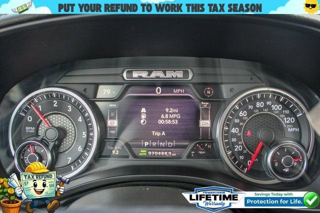 The 8-speed automatic transmission and 4-wheel drive system provide a smooth, responsive ride, while the 15 city/21 highway MPG rating ensures efficient performance. With a towing capacity of 7,100 lbs, this Ram 1500 is ready to haul your gear with ease.